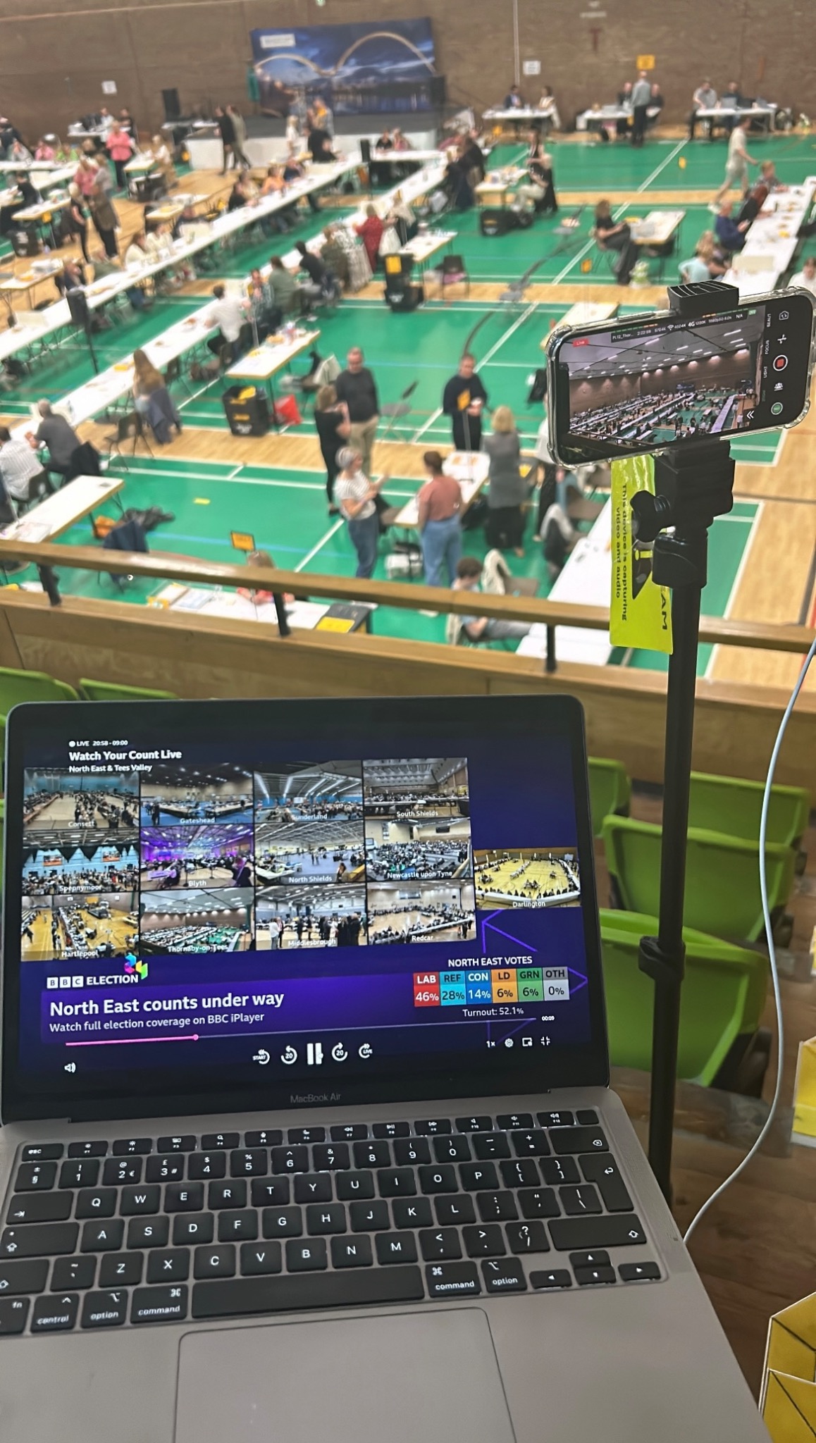 I had the privilege of working my first freelancing shift for the BBC as a 'Stringer' during the 2024 election night. I was stationed at the Stockton North and Stockton West counts, where my responsibilities included monitoring turnout figures and candidate results, which I promptly relayed to the BBC using a dedicated contact line. Additionally, I was provided with an iPhone and tripod to live stream the count for the BBC's 'Camera at Every Count' project, which was available for viewers on the BBC iplayer throughout the night.